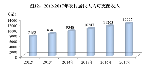 全年农村居民人均可支配收入12227元,比上年增加1024元,比上年增长9.1%。其中,工资性收入4016元,增长7.5%;经营净收入4821元,增长6.5%;财产净收入323元,增长20.1%;转移净收入3067元,增长14.8%。农村居民人均生活消费支出11397元,增长11.8%。其中,居住消费支出增长12.4%,生活用品及服务消费支出增长12.9%,交通通信支出增长17.4%,医疗保健消费支出增长12.4%。农村居民恩格尔系数37.2%。