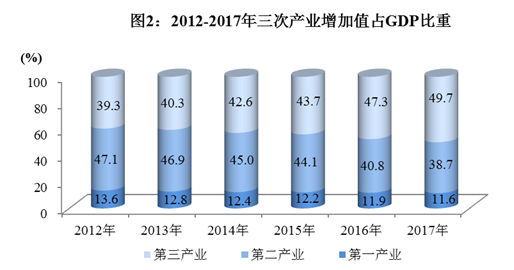 经国家统计局审定,全年实现地区生产总值(GDP)36980.2亿元,按可比价格计算,比上年增长8.1%。其中,第一产业增加值4282.8亿元,增长3.8%;第二产业增加值14294.0亿元,增长7.5%;第三产业增加值18403.4亿元,增长9.8%。三次产业对经济增长的贡献率分别为5.5%、40.8%和53.7%。人均地区生产总值44651元,增长7.5%。三次产业结构由上年的11.9:40.8:47.3调整为11.6:38.7:49.7。