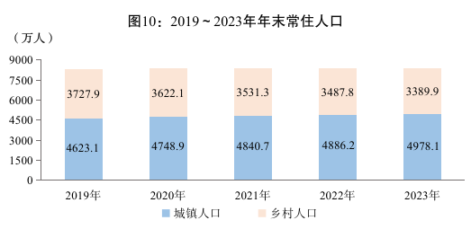 根据2023年全国人口变动情况抽样调查资料测算,全年全省常住人口出生人口52.9万人,人口出生率6.32‰;死亡人口79万人,人口死亡率9.44‰;人口自然增长率为-3.12‰。年末全省常住人口8368.0万人,比上年末减少6万人,其中城镇人口4978.1万人,乡村人口3389.9万人,常住人口城镇化率59.49%,比上年末提高1.14个百分点。年末全省户籍人口9071.4万人,比上年末增加3.9万人。