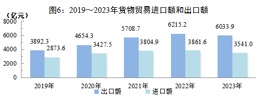 全年货物贸易进出口总额9574.9亿元,比上年下降4.0%。其中,出口额6033.9亿元,下降1.3%;进口额3541.0亿元,下降8.2%。