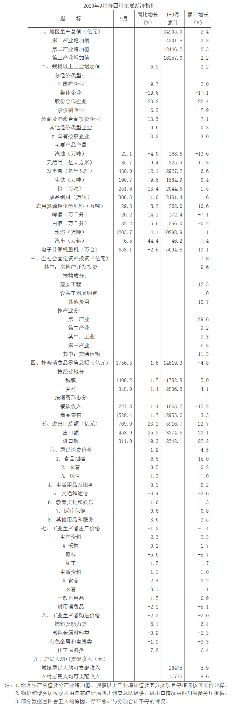 总的来看,四川经济走势与全国大势基本一致,前三季度全省多数主要经济指标恢复增长,三次产业全面增长,投资增速恢复至接近正常年度水平,消费市场信心逐步增强,经济回升势头较好,全年经济平稳增长的预期增强。同时,我省经济运行还面临部分工业行业内外循环不畅,消费市场复苏仍然缓慢,投资结构有待优化等问题。下一步,全省上下将坚持贯彻落实中央和省委省政府各项决策部署,统筹推进常态化疫情防控和经济社会发展,加快推进成渝地区双城经济圈建设,深入实施“一干多支”发展战略,坚决打赢脱贫攻坚战,如期完成全面建成小康社会各项目标任务,力争全年经济平稳健康发展。