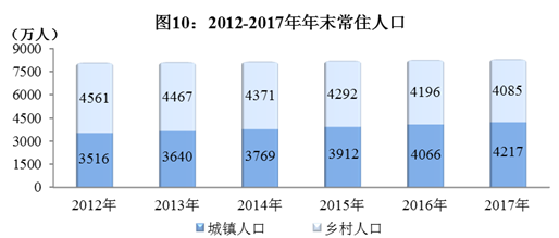 2017年全国人口变动情况抽样调查资料测算,全年出生人口93万人,人口出生率11.26‰;死亡人口58万人,人口死亡率7.03‰;人口自然增长率4.23‰。年末常住人口8302万人,比上年末增加40万人,其中城镇人口4217万人,乡村人口4085万人。常住人口城镇化率50.79%,比上年末提高1.58个百分点。
