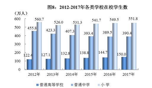 年末共有小学5721所,招生91.1万人,在校生551.8万人。初中3722所,招生87.1万人,在校生249.1万人。普通高中754所,招生46.5万人,在校生141.3万人。特殊教育学校127所,招生2650人,在校生1.5万人。中等职业教育学校520所,招生39.6万人,在校生97.4万人。职业技术培训机构4486个,职业技术培训注册学员264.3万人次。