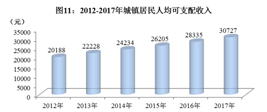 按常住地分,全年城镇居民人均可支配收入30727元,比上年增长8.4%。其中,工资性收入17299元,增长6.7%;经营净收入3586元,增长7.8%;财产净收入2627元,增长11.1%;转移净收入7215元,增长12.3%。人均消费性支出21991元,增长6.4%。其中,居住支出增长4.0%,生活用品及服务支出增长7.1%,交通通信支出增长18.6%。城镇居民恩格尔系数33.3%