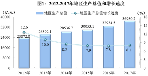 经国家统计局审定,全年实现地区生产总值(GDP36980.2亿元,按可比价格计算,比上年增长8.1%。其中,第一产业增加值4282.8亿元,增长3.8%;第二产业增加值14294.0亿元,增长7.5%;第三产业增加值18403.4亿元,增长9.8%。三次产业对经济增长的贡献率分别为5.5%40.8%53.7%。人均地区生产总值44651元,增长7.5%。三次产业结构由上年的11.940.847.3调整为11.638.749.7