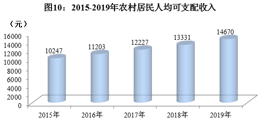 全年农村居民人均可支配收入14670元,比上年增加1339元,比上年增长10.0%。其中,工资性收入4662元,增长8.1%;经营净收入5641元,增长10.2%;财产净收入456元,增长20.3%;转移净收入3910元,增长11.0%。农村居民人均消费支出14056元,增长10.5%。其中,居住消费支出增长9.9%,生活用品及服务消费支出增长6.7%,交通通信支出增长14.5%,医疗保健消费支出增长14.6%。农村居民恩格尔系数34.7%