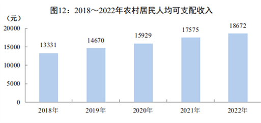 农村居民人均可支配收入18672元,比上年增加1097元,比上年增长6.2%。其中,工资性收入5844元,增长6.0%;经营净收入7045元,增长5.9%;财产净收入628元,增长7.0%;转移净收入5156元,增长6.9%。农村居民人均消费支出17199元,增长4.6%。其中,食品烟酒支出增长3.7%,生活用品和服务支出增长6.0%,教育文化娱乐支出增长10.1%,医疗保健消费支出与上年持平。农村居民恩格尔系数36.0%。