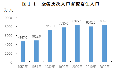 全省常住人口[2]为83674866人,与2010年第六次全国人口普查相比,增加3256666人,增长4.05%,年平均增长率为0.40%。