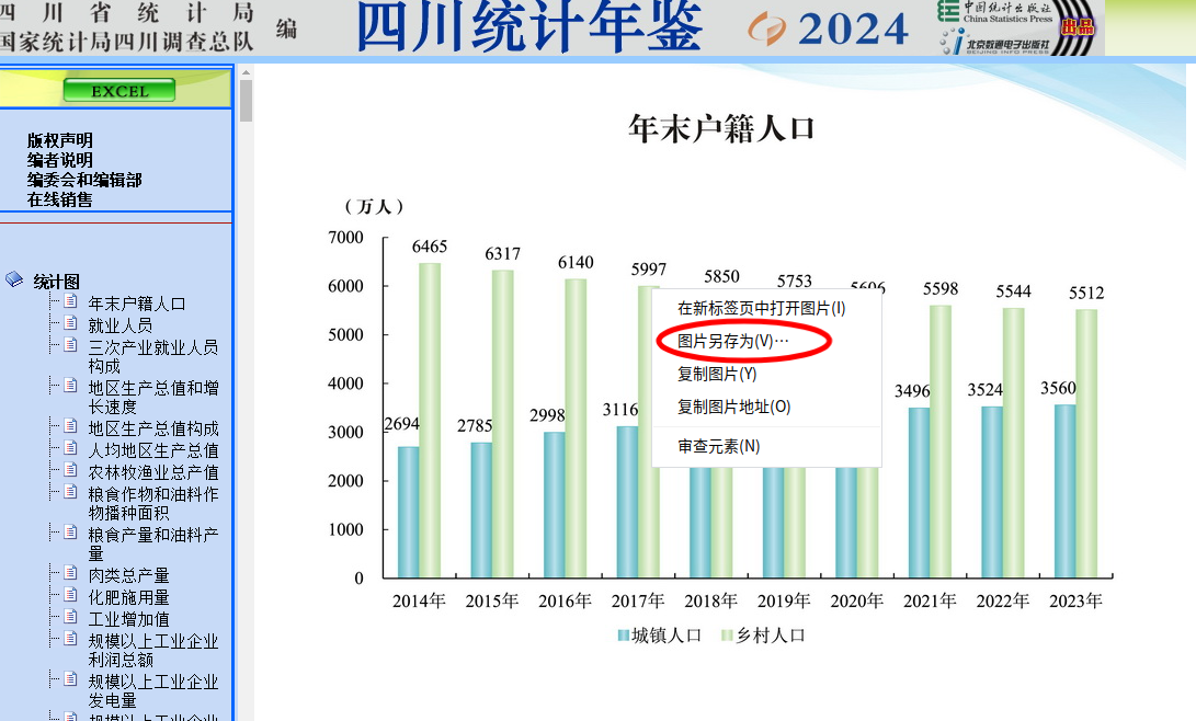3、本网站“统计年鉴”栏目链接地址:/scstjj/c112132/pic_list.shtml。打开年鉴后,两种下载方式:一是点击年鉴左上方“Excel”按键图标(若图标未显示,点击后可以正常切换),切换模式后点击目录列表可下载Excel文件;二是可直接通过在线查阅方式,在内容显示框中鼠标右击选中图片-图片另存为-选择保存位置-进行下载保存。如图所示: